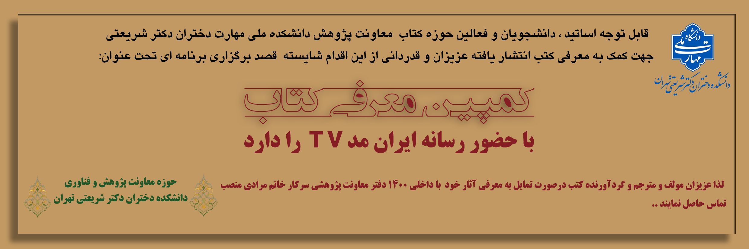 قابل توجه اساتید و دانشجویان محترم، معاونت پژوهش دانشکده جهت کمک به معرفی کتب انتشار یافته عزیزان و قدردانی از این اقدام شایسته قصد برگزاری برنامه ای تحت عنوان ((کمپین معرفی کتاب )) با حضور رسانه ایران مد TV  را دارد . لذا عزیزان مولف و مترجم و گردآورنده کتب، درصورت تمایل به معرفی آثار خود با داخلی 1400 دفتر معاونت پژوهشی سرکار خانم مرادی منصب تماس حاصل نمایند .